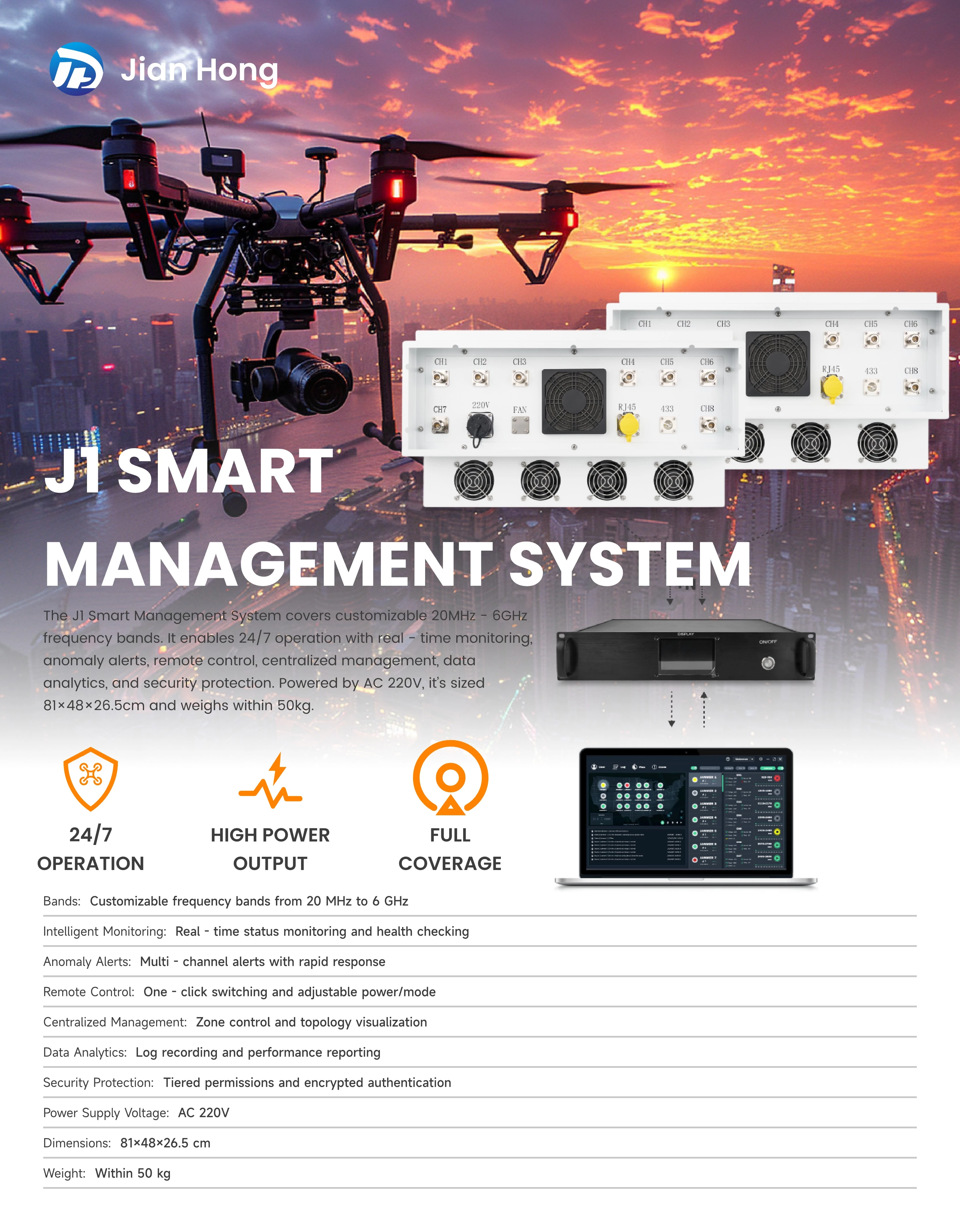 The J1 Smart Management System covers customizable 20MHz - 6GHz frequency bands. It enables 24/7 operation with real - time monitoring, anomaly alerts, remote control, centralized management, data analytics, and security protection. Powered by AC 220V, it’s sized 81×48×26.5cm and weighs within 50kg.