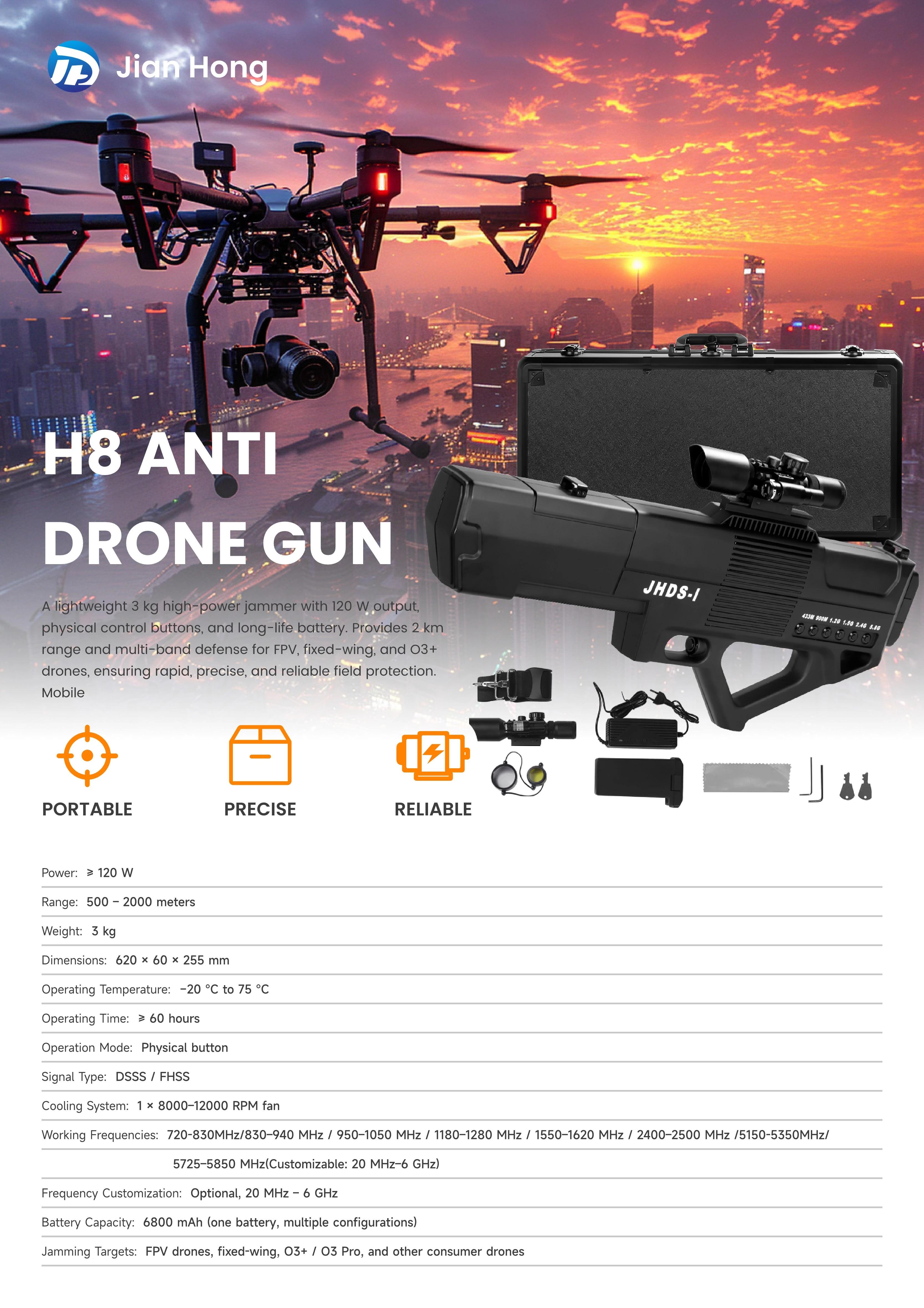 compact 3 kg design with ergonomic grip and detachable battery for easy field deployment, Precise — directional antenna and physical control interface enable accurate targeting of FPV and fixed-wing drones, Reliable — 120 W high-power output, advanced cooling, and 60-hour endurance ensure stable performance in all environments.