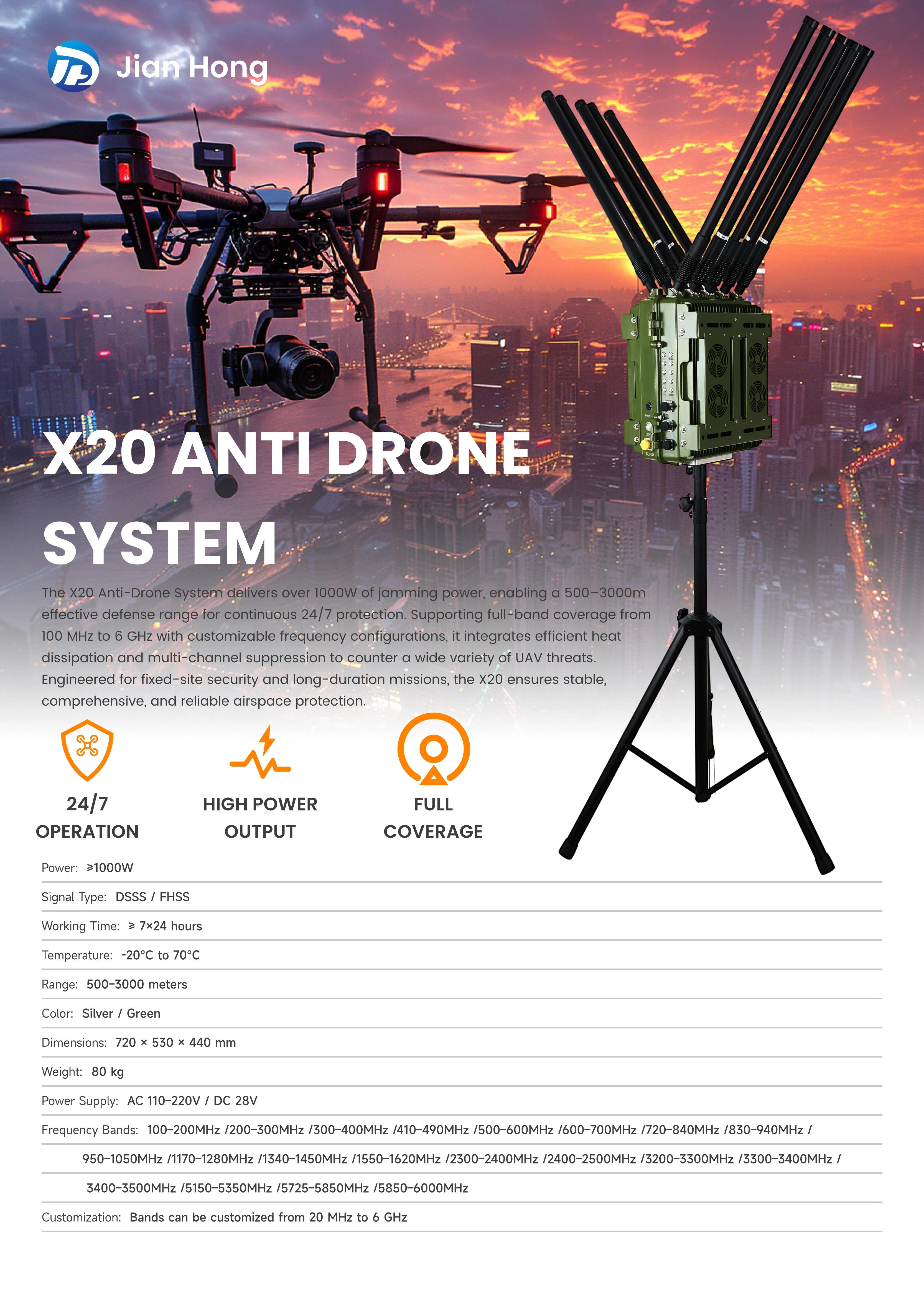 The X20 Anti-Drone System delivers over 1000W of jamming power, enabling a 500–3000m effective defense range for continuous 24/7 protection. Supporting full-band coverage from 100 MHz to 6 GHz with customizable frequency configurations, it integrates efficient heat dissipation and multi-channel suppression to counter a wide variety of UAV threats. Engineered for fixed-site security and long-duration missions, the X20 ensures stable, comprehensive, and reliable airspace protection.